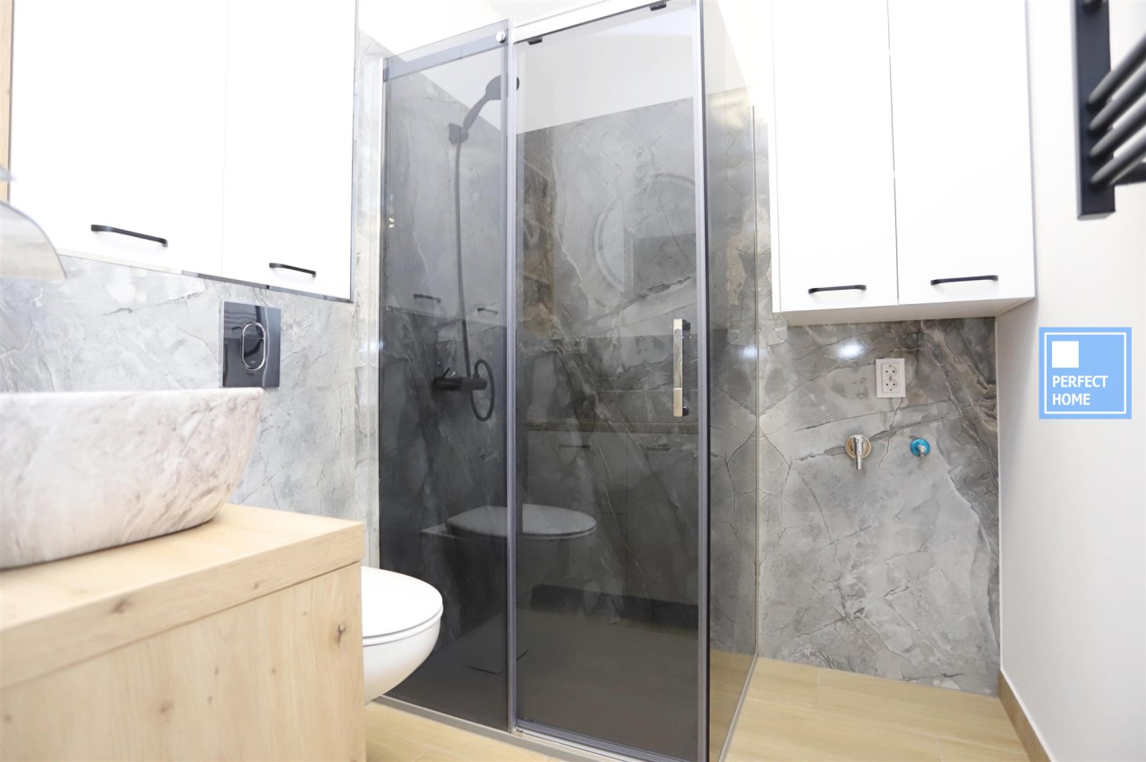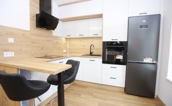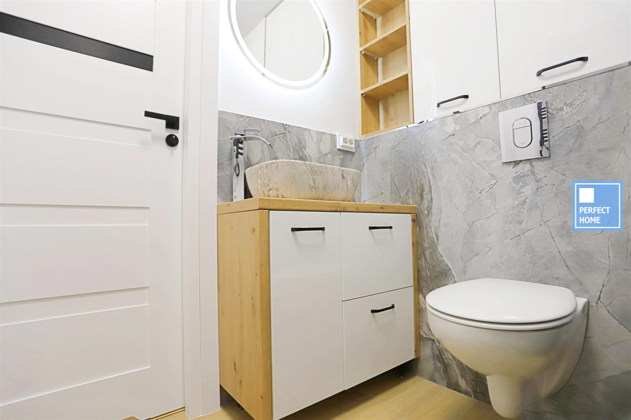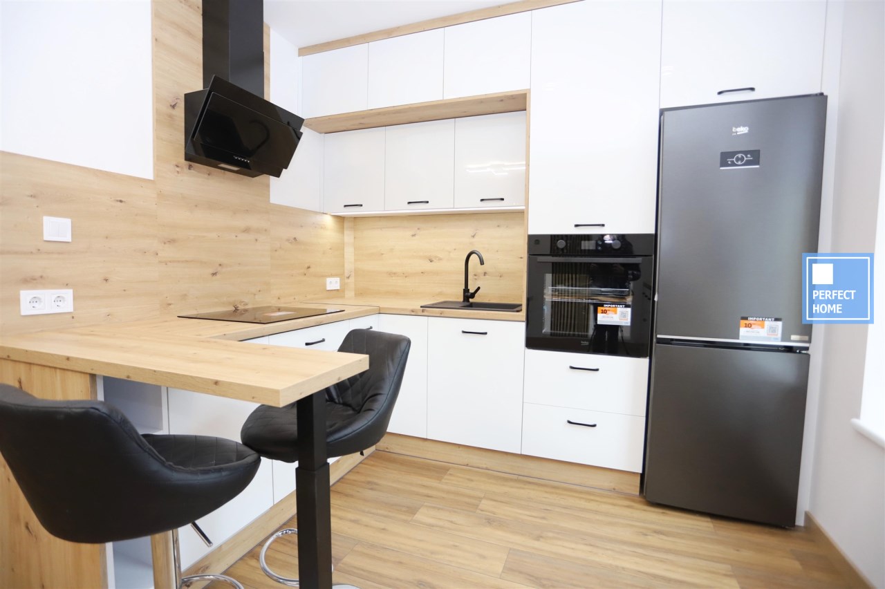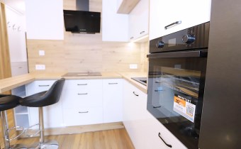Aneks kuchenny wyposażony jest w wyspę oraz nowy sprzęt AGD: lodówkę, okap, piekarnik, płytę grzewczą oraz zmywarkę – na cały sprzęt dostępne są faktury i gwarancja. Łazienka urządzona w nowoczesnym stylu, z prysznicem oraz miejscem na pralkę.
