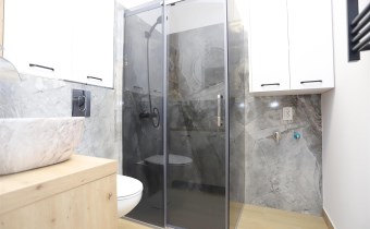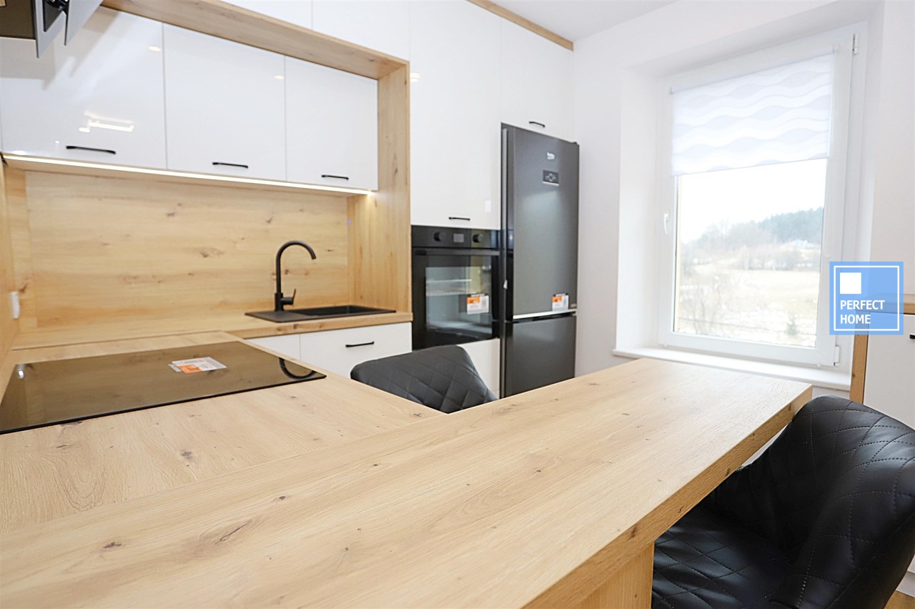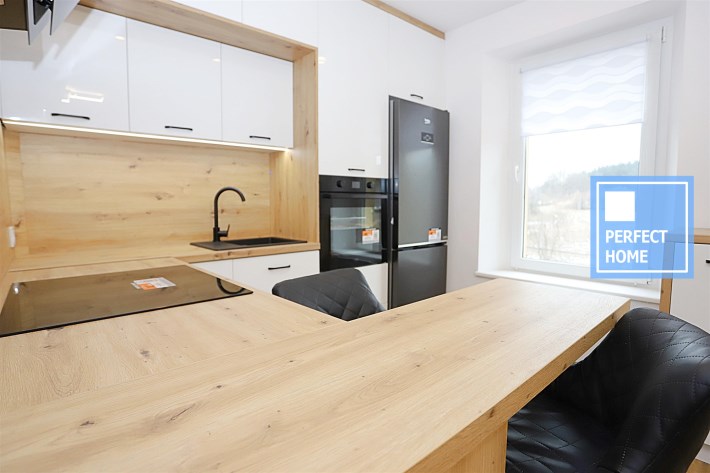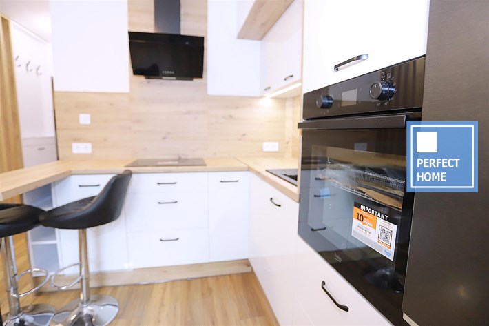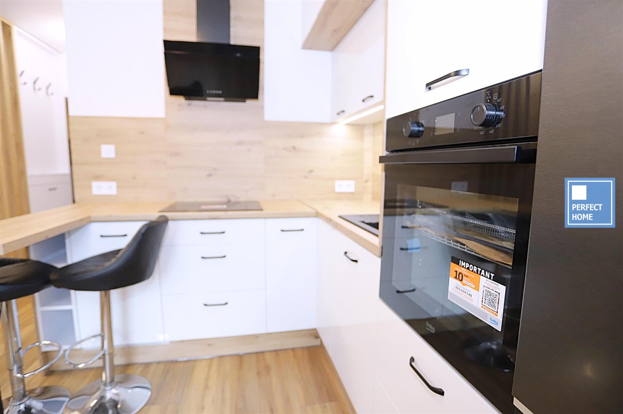 Aneks kuchenny wyposażony jest w wyspę oraz nowy sprzęt AGD: lodówkę, okap, piekarnik, płytę grzewczą oraz zmywarkę – na cały sprzęt dostępne są faktury i gwarancja. Łazienka urządzona w nowoczesnym stylu, z prysznicem oraz miejscem na pralkę.