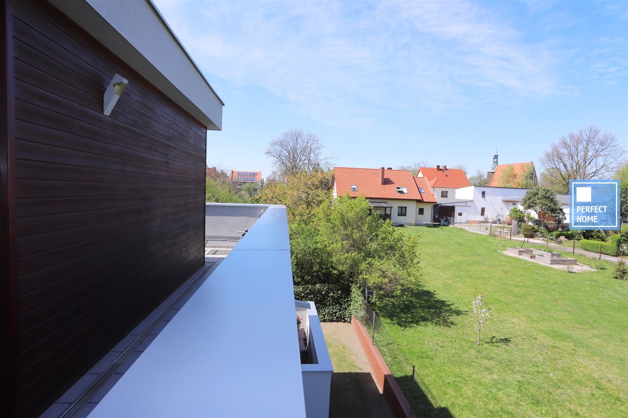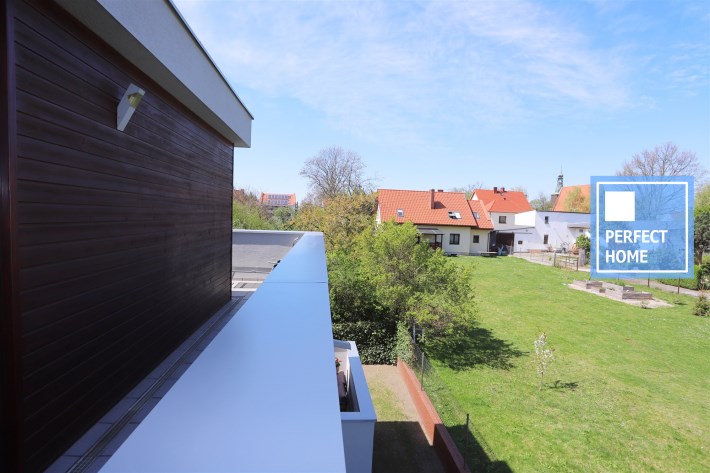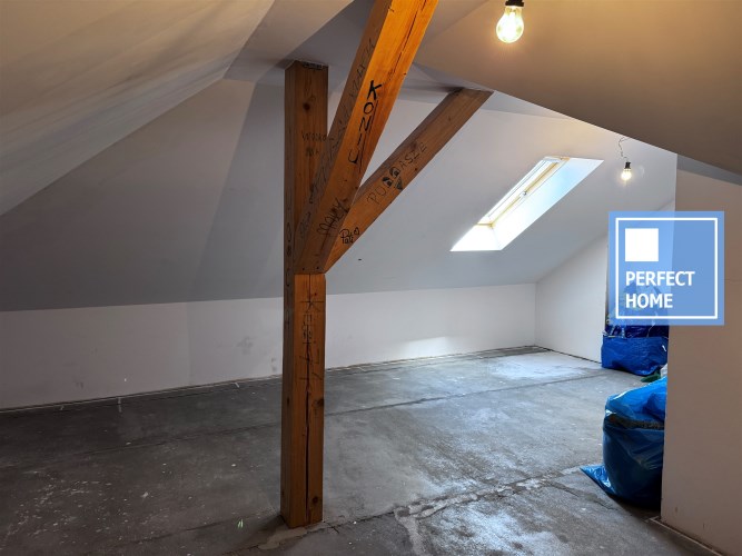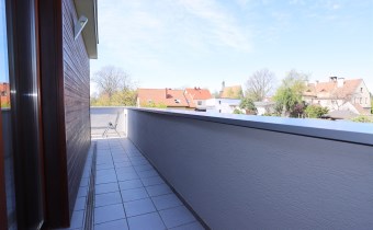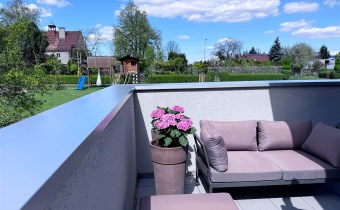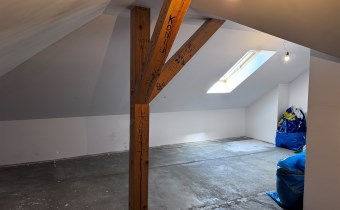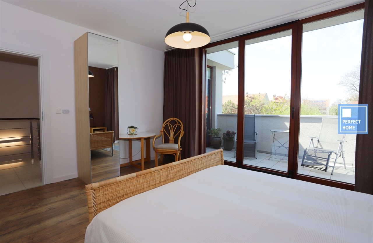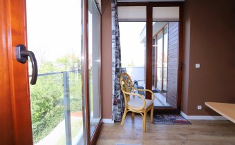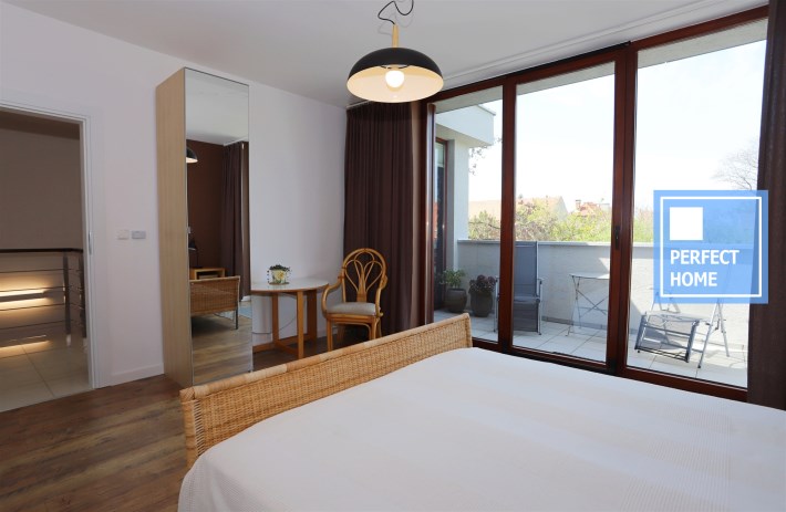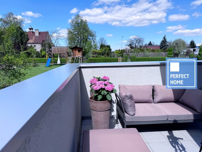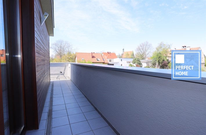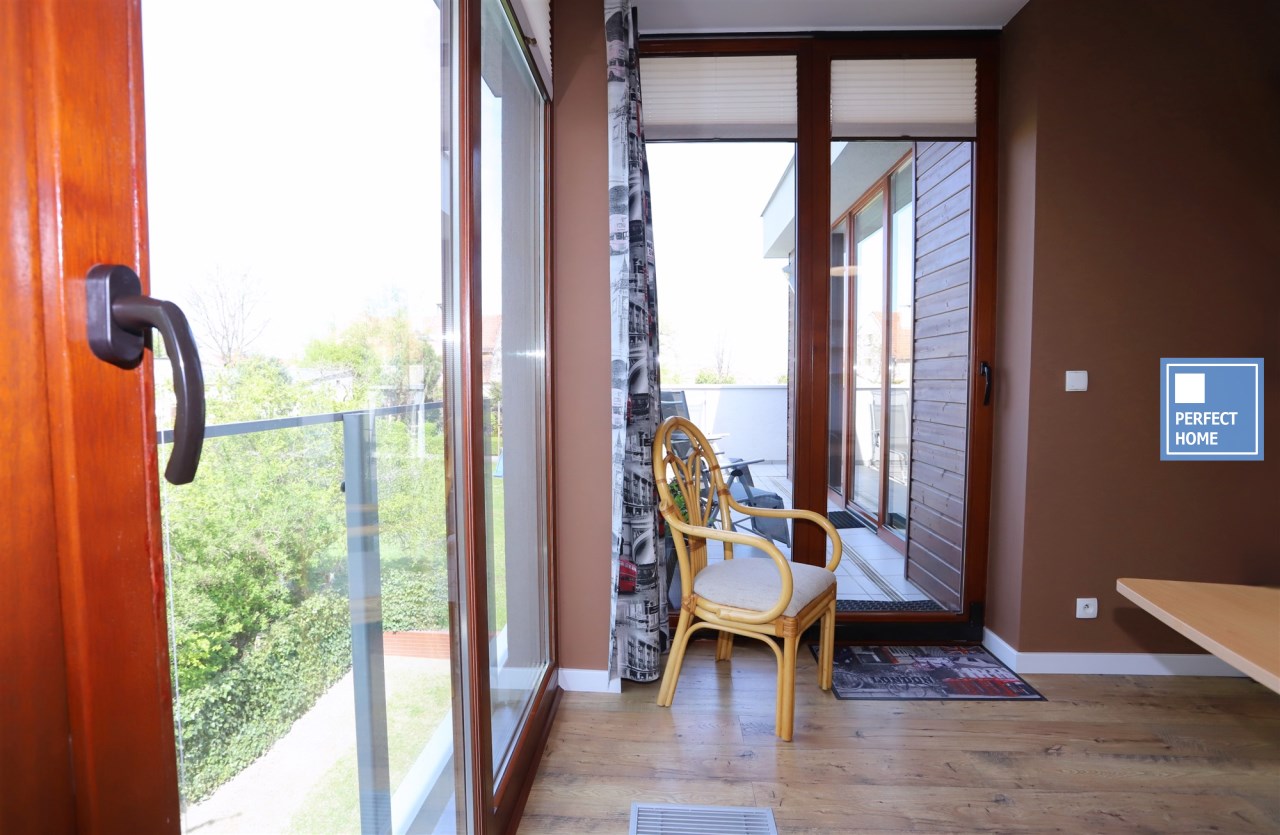 Na piętrze zaprojektowano dwie ustawne sypialnie o powierzchniach 16,50 m² i 16,89 m² – obie z wyjściem na taras – oraz dodatkowy, jasny pokój o powierzchni 10,79 m², obecnie pełniący funkcję gabinetu. Znajduje się tu również druga, przestronna łazienka z toaletą, pomieszczenie gospodarcze oraz komunikacja. Dodatkowym atutem jest dostęp do strychu o powierzchni około 50 m², zlokalizowanego bezpośrednio nad mieszkaniem, który może pełnić funkcję praktycznej przestrzeni do przechowywania lub zostać zagospodarowany według indywidualnych potrzeb. Ogrzewanie realizowane jest za pomocą instalacji gazowej z nowoczesnym systemem kanałowym typu Zehnder.