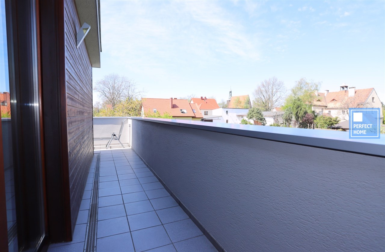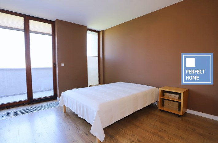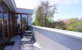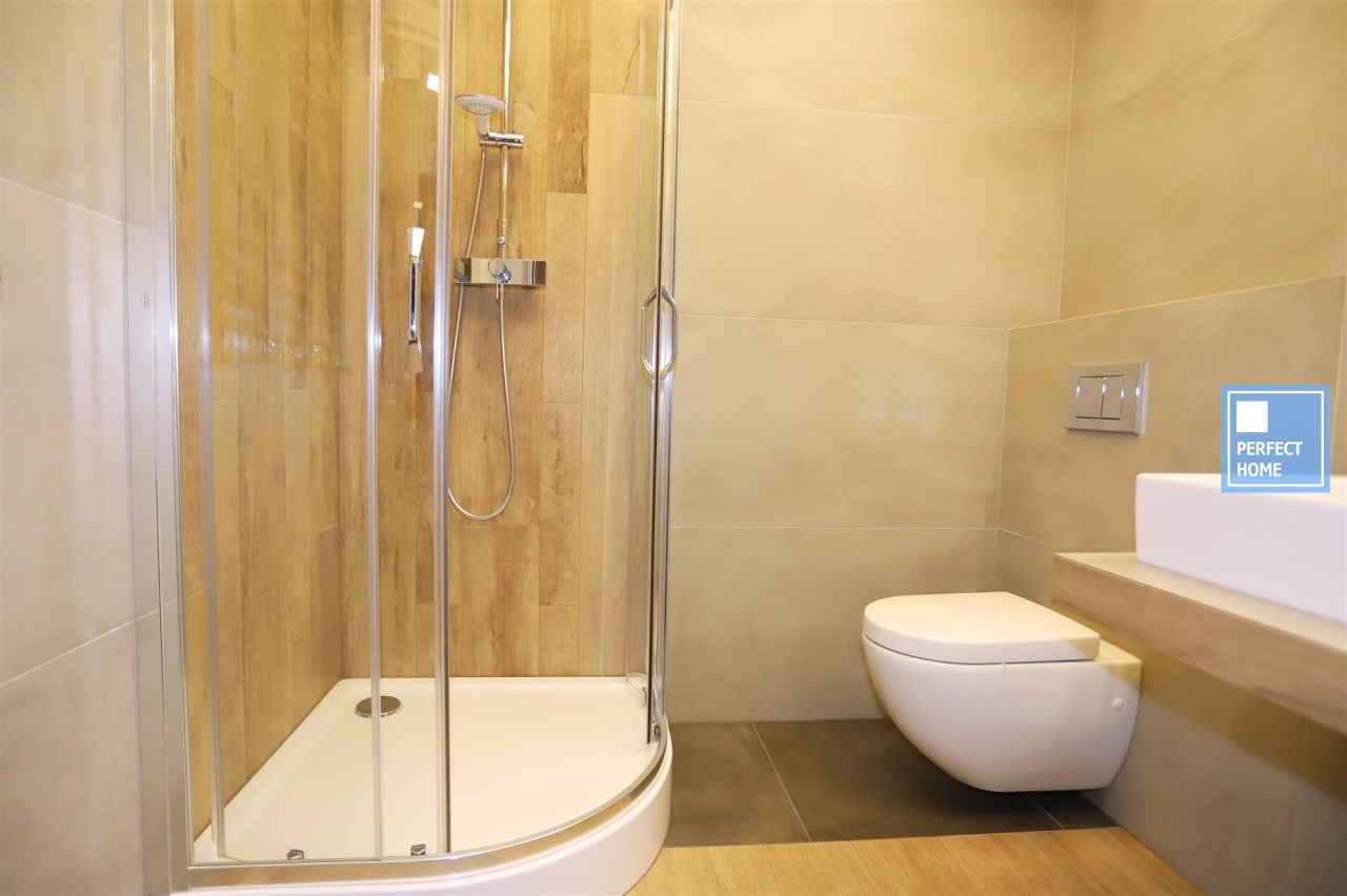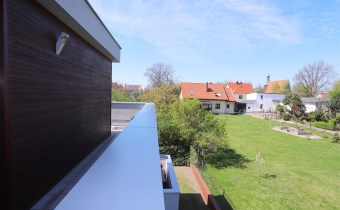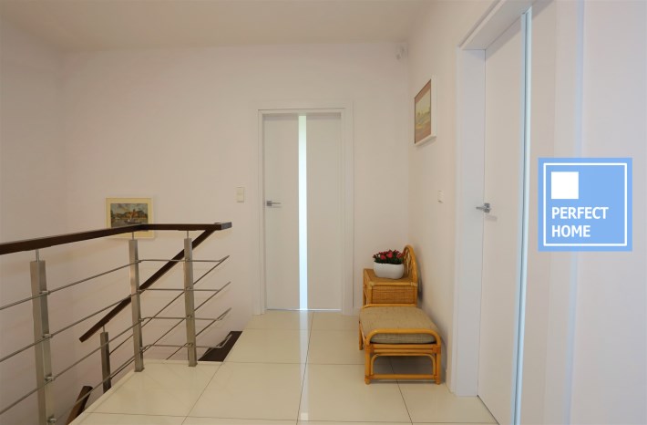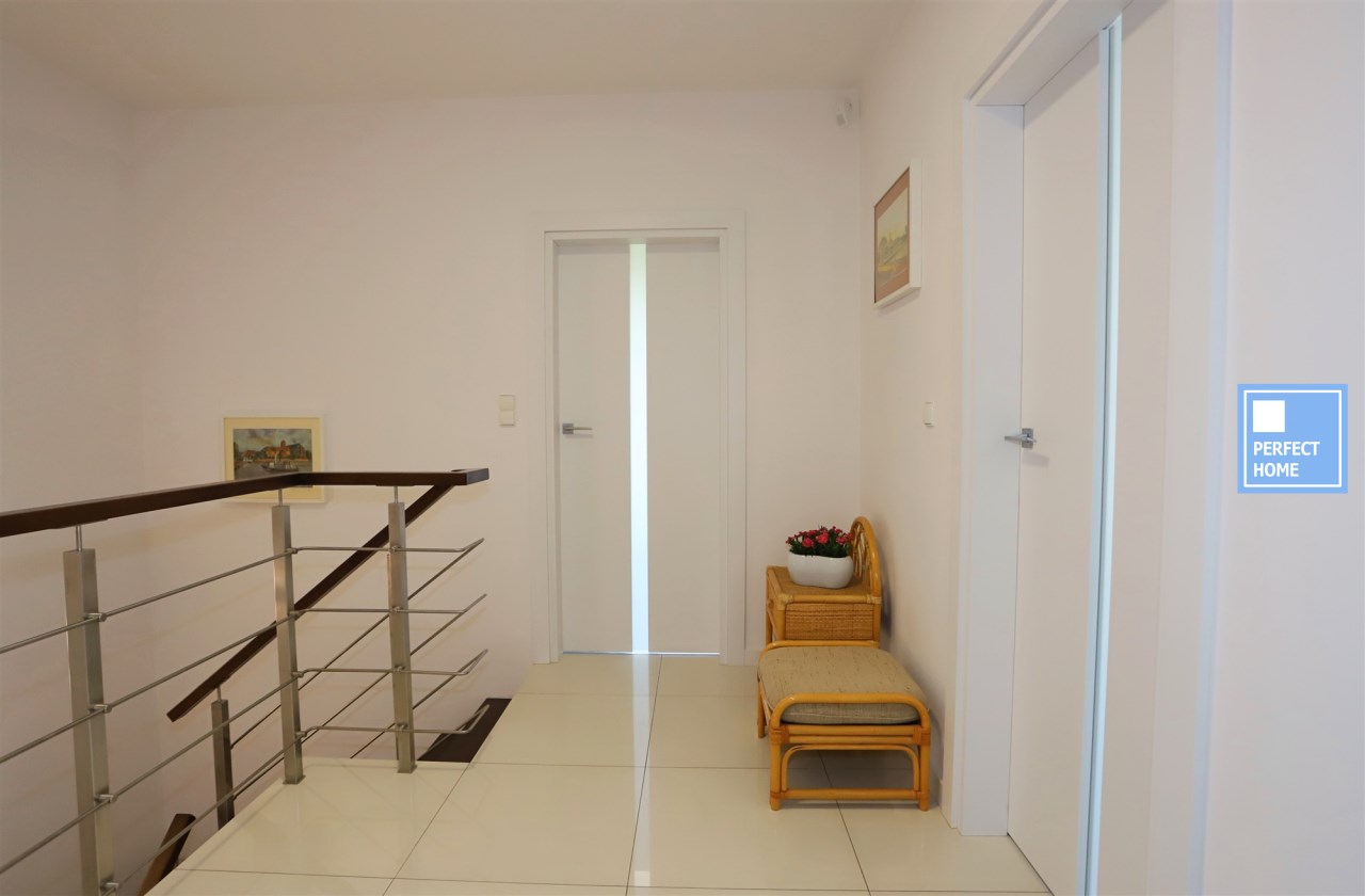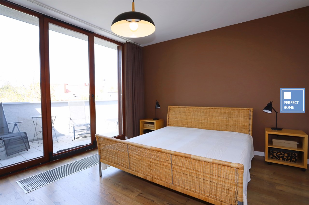 Na piętrze zaprojektowano dwie ustawne sypialnie o powierzchniach 16,50 m² i 16,89 m² – obie z wyjściem na taras – oraz dodatkowy, jasny pokój o powierzchni 10,79 m², obecnie pełniący funkcję gabinetu. Znajduje się tu również druga, przestronna łazienka z toaletą, pomieszczenie gospodarcze oraz komunikacja. Dodatkowym atutem jest dostęp do strychu o powierzchni około 50 m², zlokalizowanego bezpośrednio nad mieszkaniem, który może pełnić funkcję praktycznej przestrzeni do przechowywania lub zostać zagospodarowany według indywidualnych potrzeb. Ogrzewanie realizowane jest za pomocą instalacji gazowej z nowoczesnym systemem kanałowym typu Zehnder.