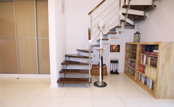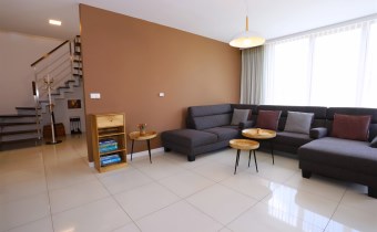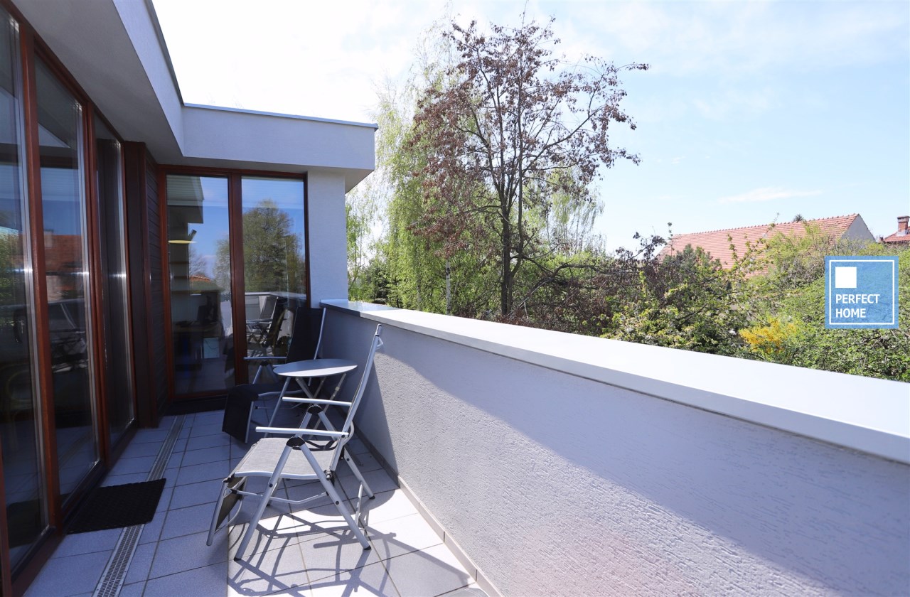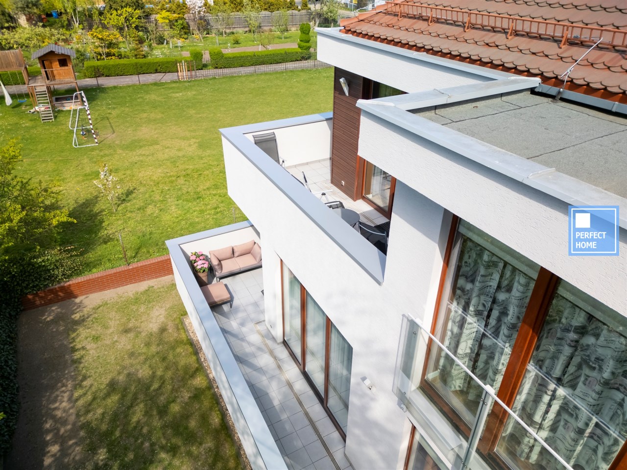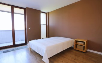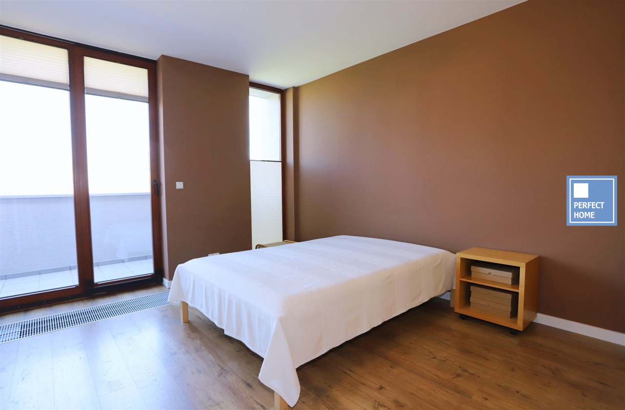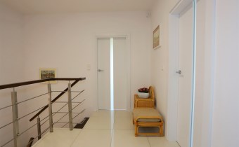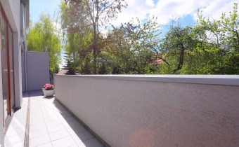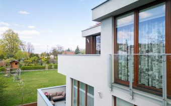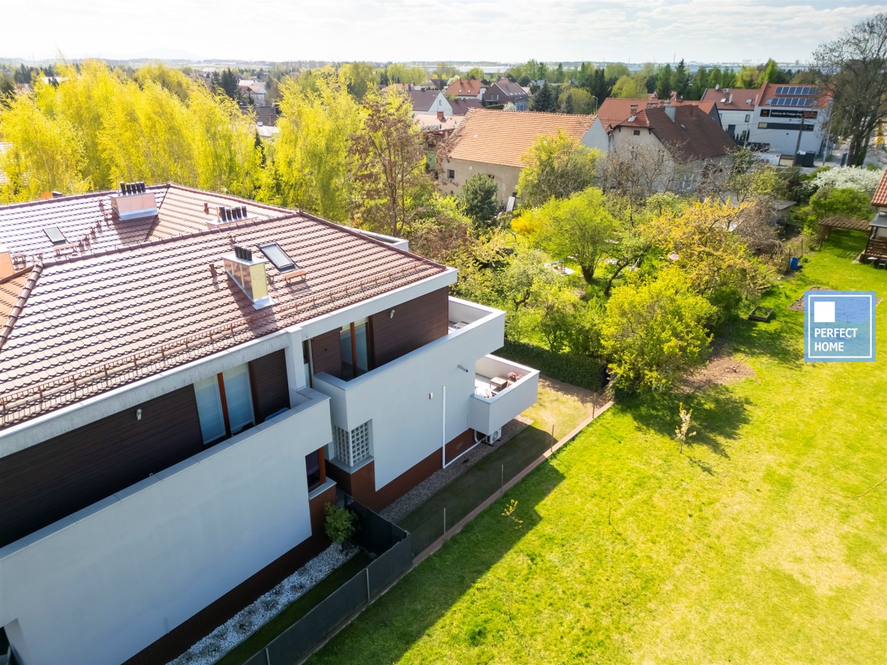 Na piętrze zaprojektowano dwie ustawne sypialnie o powierzchniach 16,50 m² i 16,89 m² – obie z wyjściem na taras – oraz dodatkowy, jasny pokój o powierzchni 10,79 m², obecnie pełniący funkcję gabinetu. Znajduje się tu również druga, przestronna łazienka z toaletą, pomieszczenie gospodarcze oraz komunikacja. Dodatkowym atutem jest dostęp do strychu o powierzchni około 50 m², zlokalizowanego bezpośrednio nad mieszkaniem, który może pełnić funkcję praktycznej przestrzeni do przechowywania lub zostać zagospodarowany według indywidualnych potrzeb. Ogrzewanie realizowane jest za pomocą instalacji gazowej z nowoczesnym systemem kanałowym typu Zehnder.