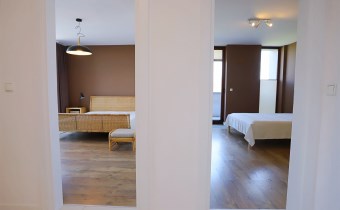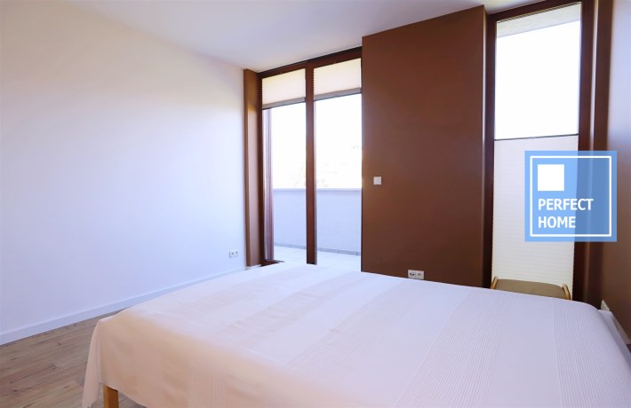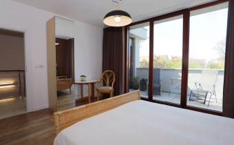 Całość przestrzeni została zaprojektowana w sposób spójny i funkcjonalny. Duże przeszklenia oraz wyjścia na tarasy z każdego pokoju zapewniają doskonałe doświetlenie i poczucie bliskości z otaczającą budynek zielenią.