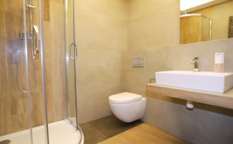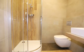Wyposażenie łazienki kabina prysznicowa, lustro, pralka, umywalka, wanna, WC