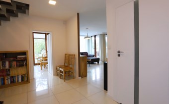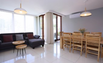 Nieruchomość wyróżnia się przemyślanym układem pomieszczeń oraz dużą ilością światła dziennego. Główna część mieszkalna o powierzchni 64,66 m² stanowi otwartą strefę dzienną, obejmującą kuchnię, jadalnię oraz salon. Naturalnym przedłużeniem tej przestrzeni jest taras z bezpośrednim zejściem do przydomowego ogrodu. Na tym poziomie znajduje się również sypialnia (10,75 m2) z wyjściem na taras, łazienka z toaletą, przestronny przedpokój oraz klatka schodowa prowadząca na piętro. Całość jest klimatyzowana, co znacząco podnosi komfort użytkowania w cieplejsze dni.
