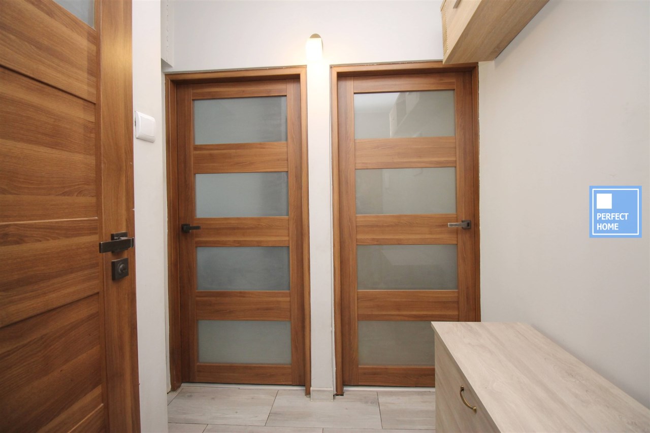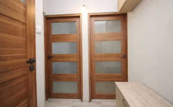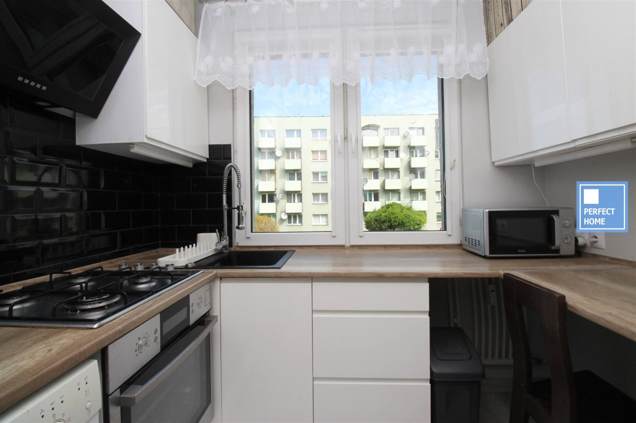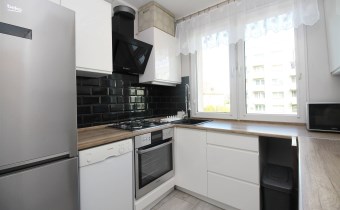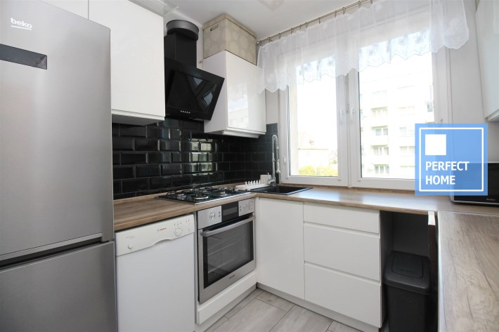 Mieszkanie jest w pełni umeblowane i wyposażone oraz gotowe do zamieszkania. Kuchnia została zabudowana meblami na wymiar oraz wyposażona w sprzęt AGD: lodówkę, zmywarkę i piekarnik. Dodatkowo do dyspozycji najemcy pozostają podstawowe akcesoria kuchenne, takie jak garnki czy naczynia. W jednym z pokoi znajduje się meblościanka wraz z TV oraz kanapa, natomiast w drugim – kanapa i komoda. W łazience dostępna jest pralka.